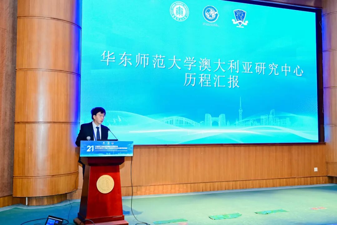 华东师范大学国际合作与交流处处长蒯曙光作主题发言。他立足于学校国际化战略,细数中心依托国际合作实现的突破。他指出,近年来中心已经实现从国别研究到全球视野的升级,澳研工作在服务国家战略与全球治理中正在焕发更强生命力。