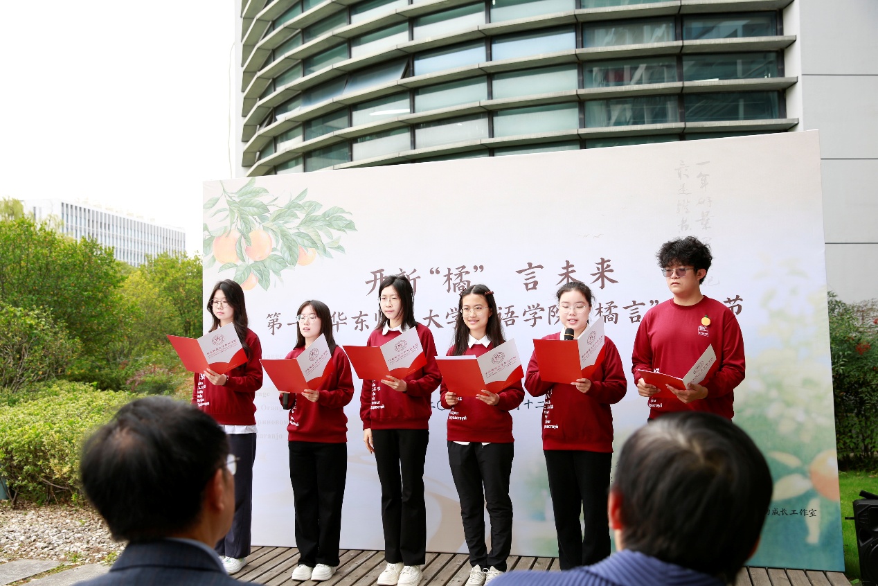多语种朗诵《橘颂》(2024级翻译(双学位)本科卢芷萱、2022级日语本科黄子衿、2025级法语硕士夏豆豆、2025级德语硕士张邵楠、2024级俄语本科许明顺、2024级西班牙语本科王茜)