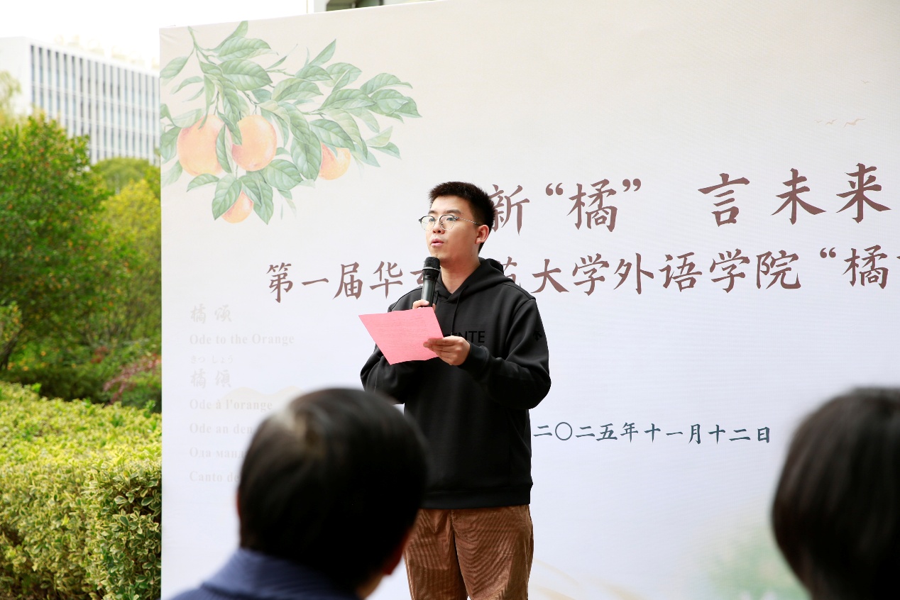 “这次朗诵不仅让我重新领悟了橘的意象,也让我有机会与老一辈翻译家跨时空对话。我诵读的英文译文翻译自丽娃河畔的翻译家孙大雨,经过推敲琢磨,屈原笔下的橘树品格在异语音韵中娓娓道来,我真切体会到翻译家对‘信达雅’的追求。”翻译专业2024级本科生卢芷萱分享到。
