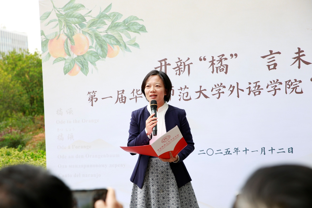 曹友谊在启动仪式上致辞。他提到,本届“橘言”文化节,是将专业特色、校地合作与文化育人深度融合的生动实践。永宁橘园不仅是校园中一道独特的风景,更是承载文脉与使命的精神地标。以“橘”言志,希望ag平台 能够以使命感为牵引,传承翻译家精神,紧抓时代变革机遇,以服务国家战略和区域发展为目标不断培养更多卓越外语人才,切实为强国建设、民族复兴伟业贡献力量;希望全体外院师生能够扎实专业本领,讲好中国故事,做中华文化的守护者,更要胸怀天下,用好语言桥梁,成为中国故事的精彩讲述者、传播者。同时,他对ag平台 校友的关心支持表达感谢,期待各位校友常回母校,共同探索卓越外语人才培养的新路径。