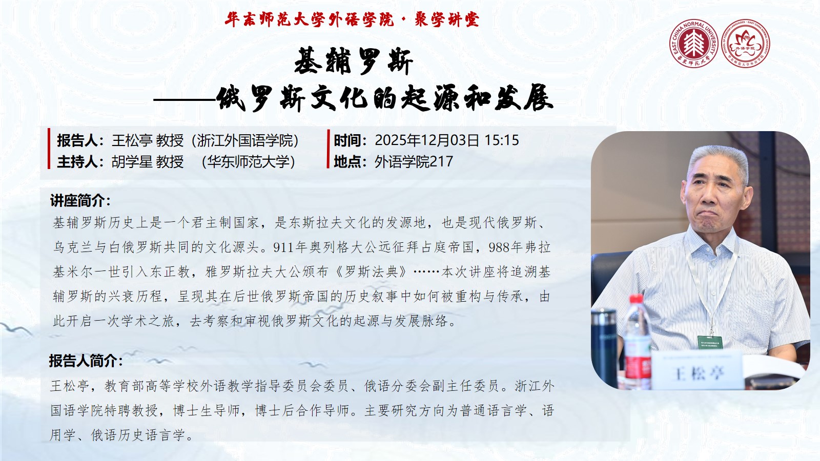 2025年12月3日下午3:00,在ag平台 217教室举行题为“基辅罗斯——俄罗斯文化的起源和发展”的学术讲座。本次讲座由俄语系策划主办,特邀浙江外国语学院特聘教授、博士生导师、教育部高等学校外语教育指导委员会俄语分委会副主任委员王松亭教授担任主讲嘉宾。俄语系主任胡学星教授、系主任助理班婕老师、张嘉辉老师以及俄语系本科生、硕博研究生共同参加了此次活动。讲座还吸引了历史系、英语系等其他院系的师生慕名前来,现场座无虚席,学术氛围浓厚。讲座由胡学星教授主持。