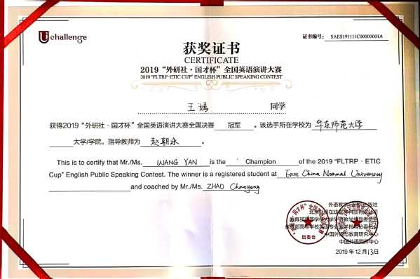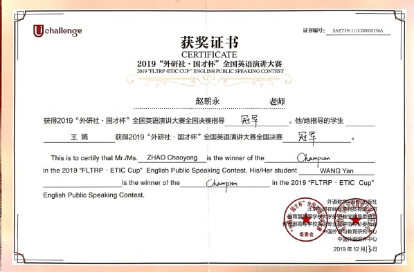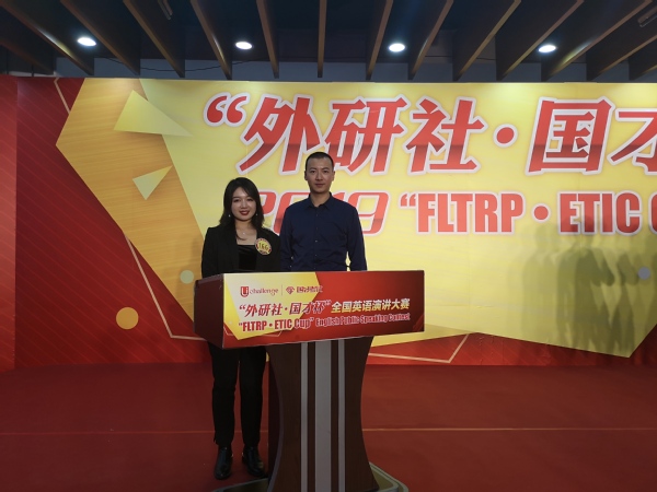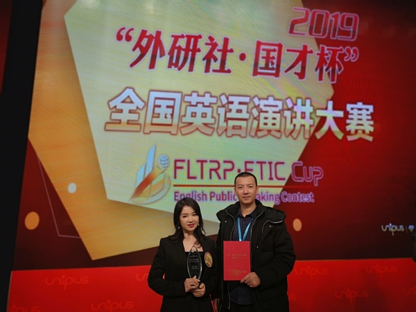 2019年12月9-13日,“外研社·国才杯”全国英语演讲大赛(“FLTRP·ETIC Cup” English Public Speaking Contest)在北京外研社国际会议中心隆重举行,共有来自全国180名选手同台竞技。在历时五天、鏖战四轮之后,我校ag平台 赵朝永副教授指导的2018级法学专业王嫣同学一路过关斩将、夺得本届大赛的全国总冠军,实现师大英语演讲比赛全国冠军为零的突破!