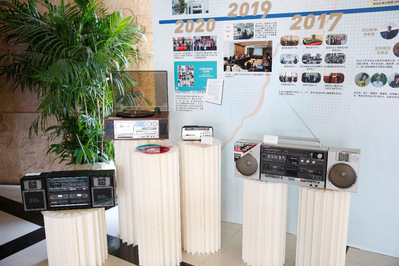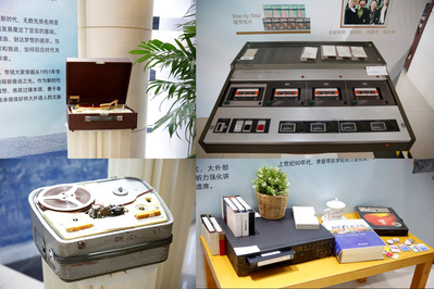 本次展览中最引人注目的是各类大型语音学习设备,如拷带机、开盘机、电唱机、收音机等,这些“神器”和背后默默付出的老师们是这些温暖声音的来源。早在计算机尚未流行的上世纪八十年代中期,华东师大的学生就可以走进一片专属于英语听力的小天地,通过外语系教研室老师搜集和制作的成百上千盘的外语磁带,享受到海量听力资源。