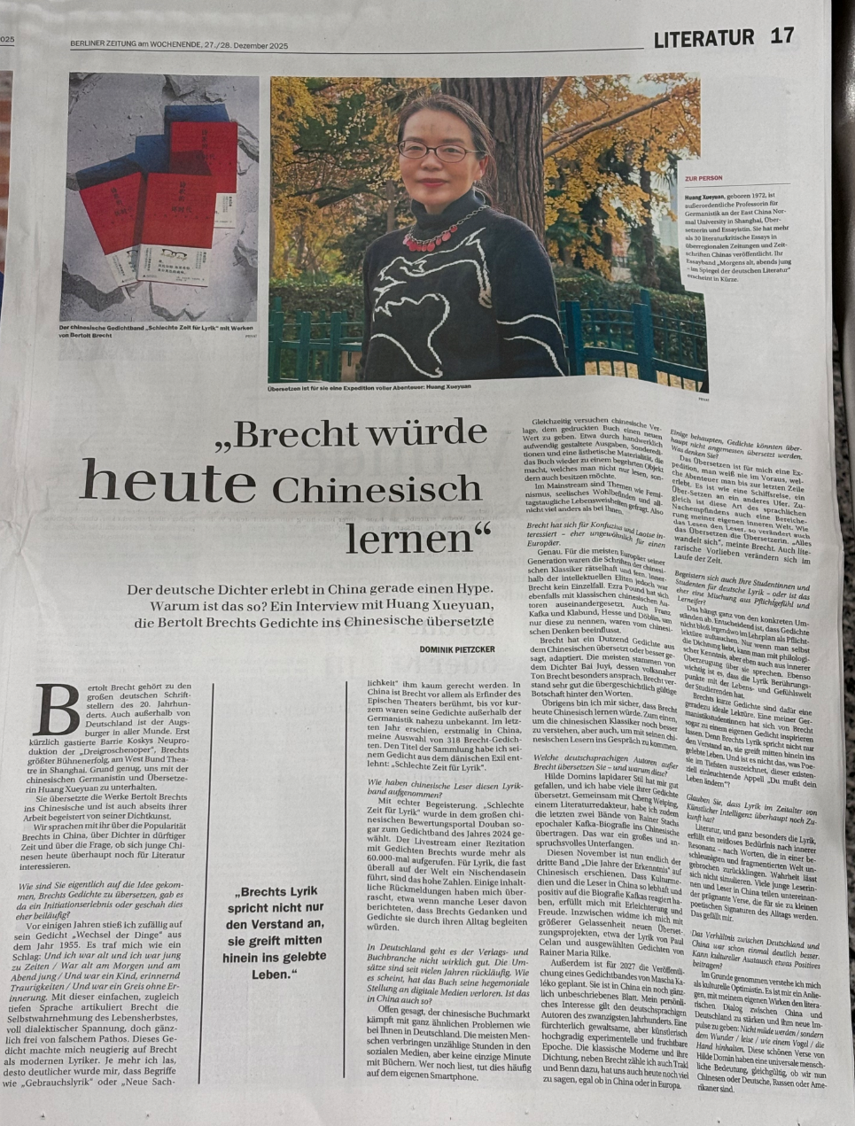 贝托尔特·布莱希特是20世纪德国最伟大的作家之一,在德国之外,也声名卓著。不久前,巴里·科斯基(Barrie Kosky)全新制作的布莱希特经典剧目《三分钱歌剧》新版在上海西岸大剧院首演,这部作品是布莱希特戏剧的巅峰之作。借此契机,我们专访了华东师范大学德语系副教授、翻译家黄雪媛女士。她不仅将布莱希特的作品译为中文,在翻译工作之外,亦对布莱希特的诗歌满怀热忱。我们与她畅谈了布莱希特在中国的受欢迎程度,讨论了这位曾处于艰难时世的诗人以及中国年轻人是否仍对文学抱有兴趣等话题。
