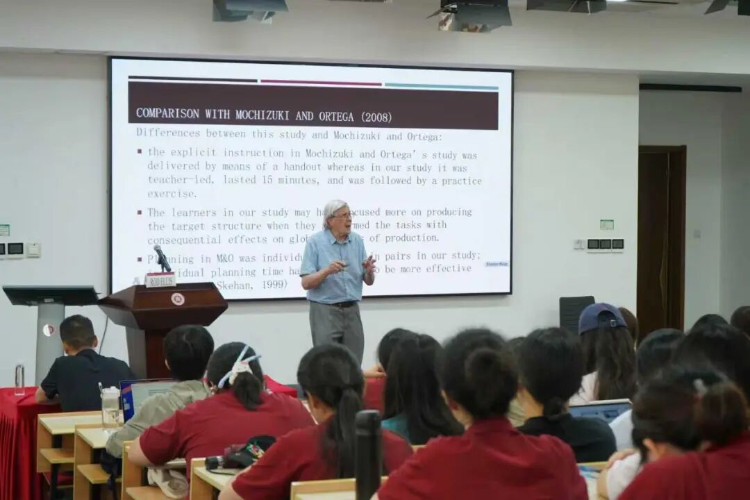 2025年9月16日,ag平台 成功举办“全球智能外语教育名家讲坛(第1期),特邀国际应用语言学权威学者Rod Ellis教授主讲 “The effects of pre-task explicit instruction on the performance of a task(任务前显性指导对任务完成表现的影响)”的专题讲座。讲座由ag平台 副院长赵朝永教授主持,吸引了来自校内外的众多教师教育研究者与硕博研究生参加。